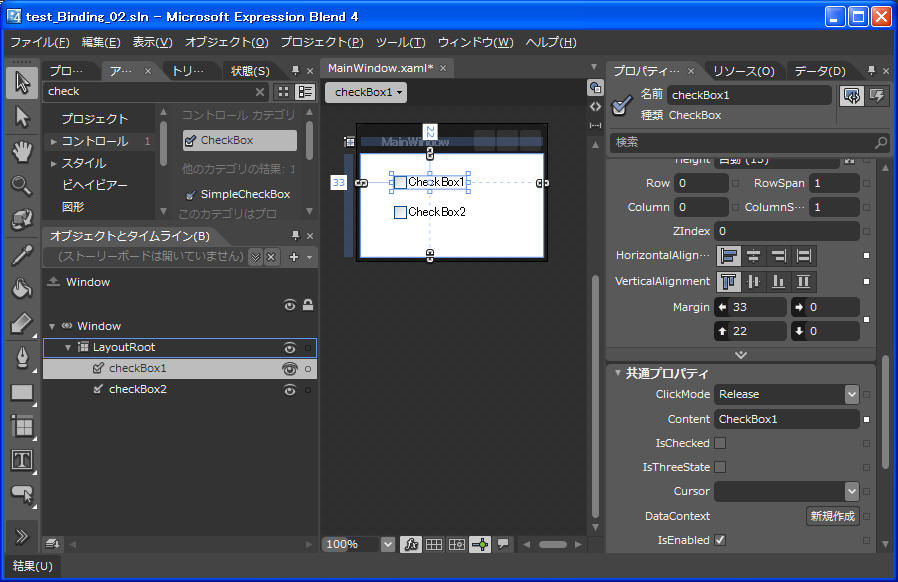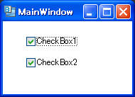 がバインドできていることを確認するためにもう一つCheckBoxを加え、下記のような画面を作成します。