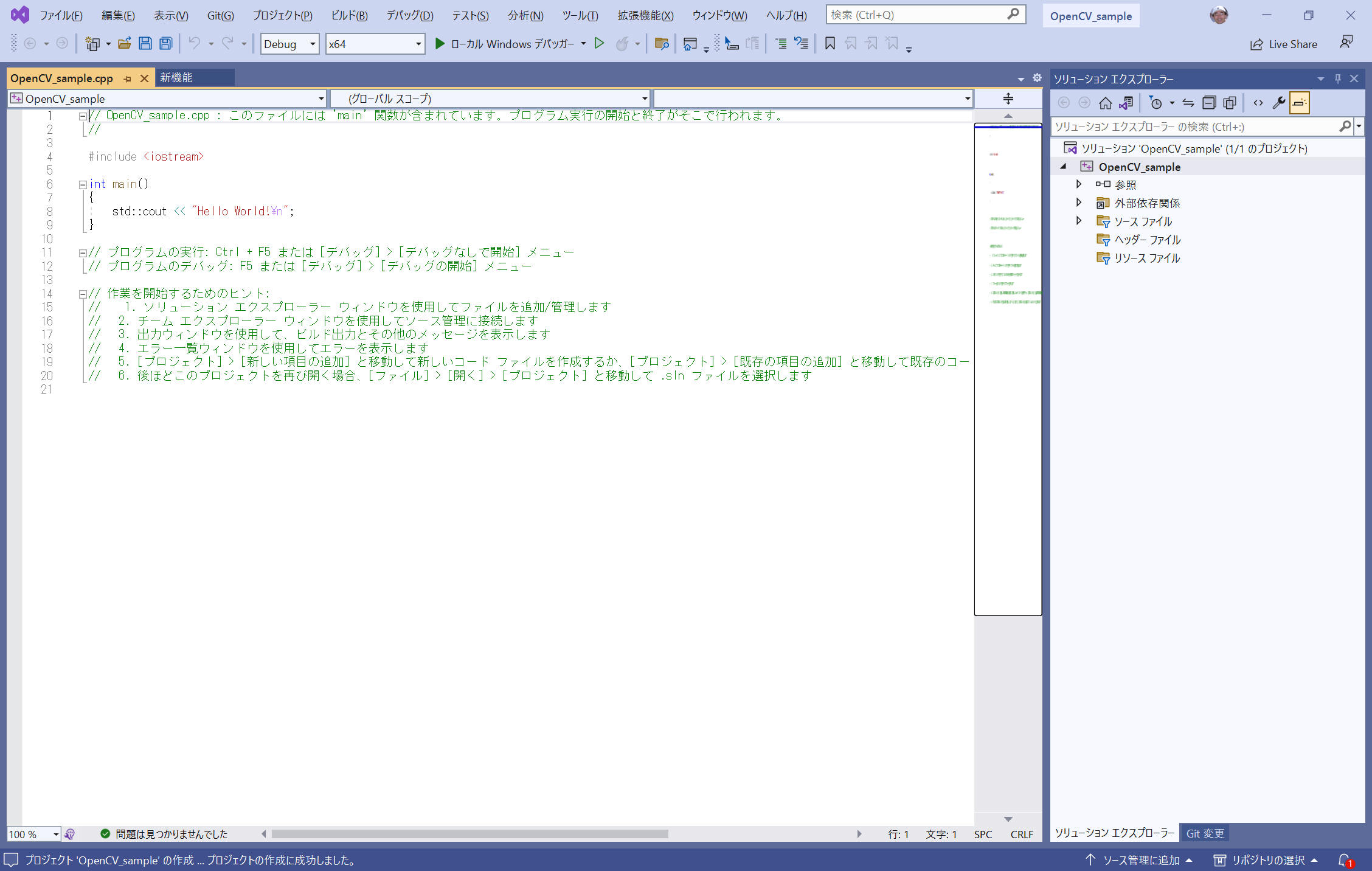 "OpenCV_sample.cpp" に以下の動作確認用プログラムを入力します。